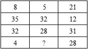 【解析】 观察可知,8-5=2+1,35-32=1+2,32-28=3+1。即每行第一列的数字减去第二列的数字所得的结果等于第三列的个位和十位数字之和。?=4-(2+8)=-6