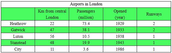 The table introduces the five airports in London from four aspects: distance from downtown, passenger flow, history and runways.