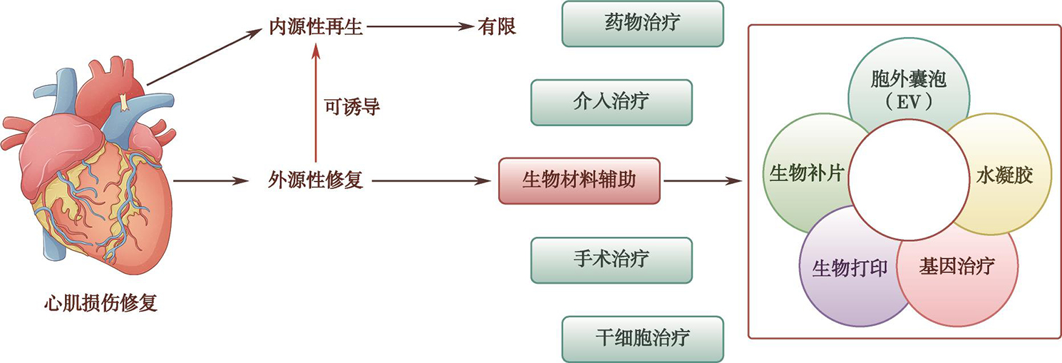 修复是指损伤造成机体部分细胞和组织丧失后,机体对所形成的缺损进行修补恢复的过程。外源性是指来自身体外部的因素,如外界环境中的物质或外部的影响。外源性修复是指通过外部干预手段促进心血管损伤修复的过程。常见的外源性修复包括药物治疗、手术治疗、干细胞疗法、生物材料应用等。其中,干细胞疗法是指通过移植外源性干细胞,如间充质干细胞(mesenchymal stem cell,MSC)、多能干细胞(pluripotent stem cell,PSC),使其分化为心肌细胞,补充损伤区域的功能性组织。生物材料应用是指利用一些生物材料,为细胞生长提供微环境,促进血管生成和组织修复。常见的生物材料包括可降解支架、水凝胶、生物补片、胞外囊泡(extracellular vesicle,EV)、类器官等。也有用干细胞疗法和生物材料相结合的手段,如利用诱导多能干细胞(induced pluripotent stem cell,iPSC)分化的心肌细胞或心肌靶向肽,联合生物材料重建受损的心脏结构。
