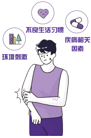 机械刺激,如经常搔抓、摩擦皮肤;化学物质刺激,如毛织物、漂白剂刺激皮肤。