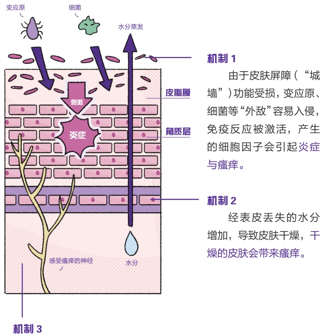 特应性皮炎往往表现为皮肤干燥、皮肤屏障功能受损。皮肤屏障功能受损后,有三个机制会让人感到瘙痒。