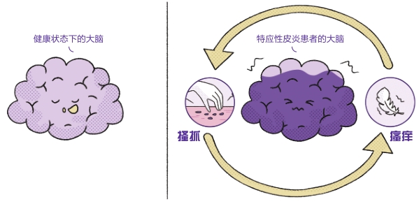 但和其他因素导致的瘙痒不一样,特应性皮炎患者特别容易陷入 “瘙痒-搔抓” 的恶性循环。对于病情严重的特应性皮炎患者,他们的脊髓和大脑中和神经有关的通路会出现结构和功能性改变, 这会让中枢神经变得过度敏感,结果就表现为总是忍不住搔抓的情况。 有的特应性皮炎患者甚至只是看到或者听到一些和“痒”有关的内容,就可能引发瘙痒的感觉和搔抓的动作,这就是所谓的“传染性”瘙痒。