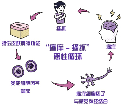瘙痒会引起搔抓反射,搔抓又会加重瘙痒,如此循环往复,患者自然会反复挠痒痒,就像上瘾了一样,无论如何都停不下来。