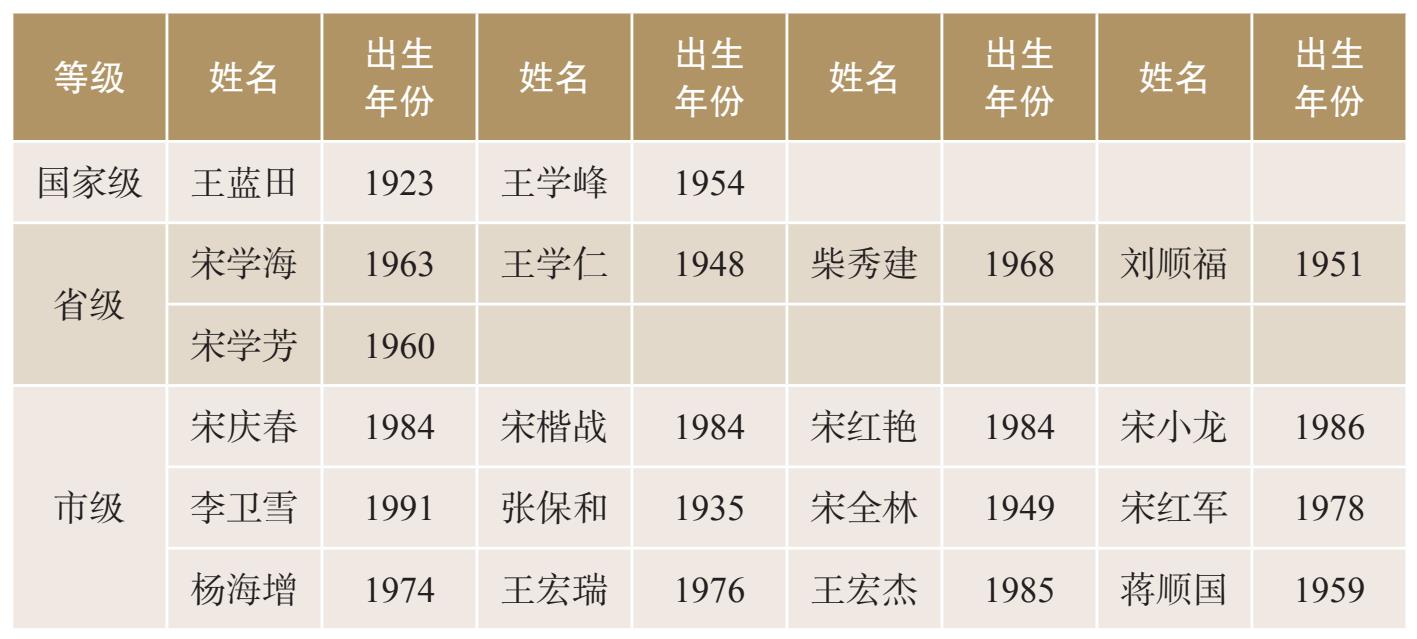 根据2016年2月至今的实地调查,目前实际生产泥咕咕的有76户。其中,有50户家庭会在正月古庙会摆摊,26户是非物质文化遗产保护项目各级别的代表性传承人(见表1-7、表1-8)。