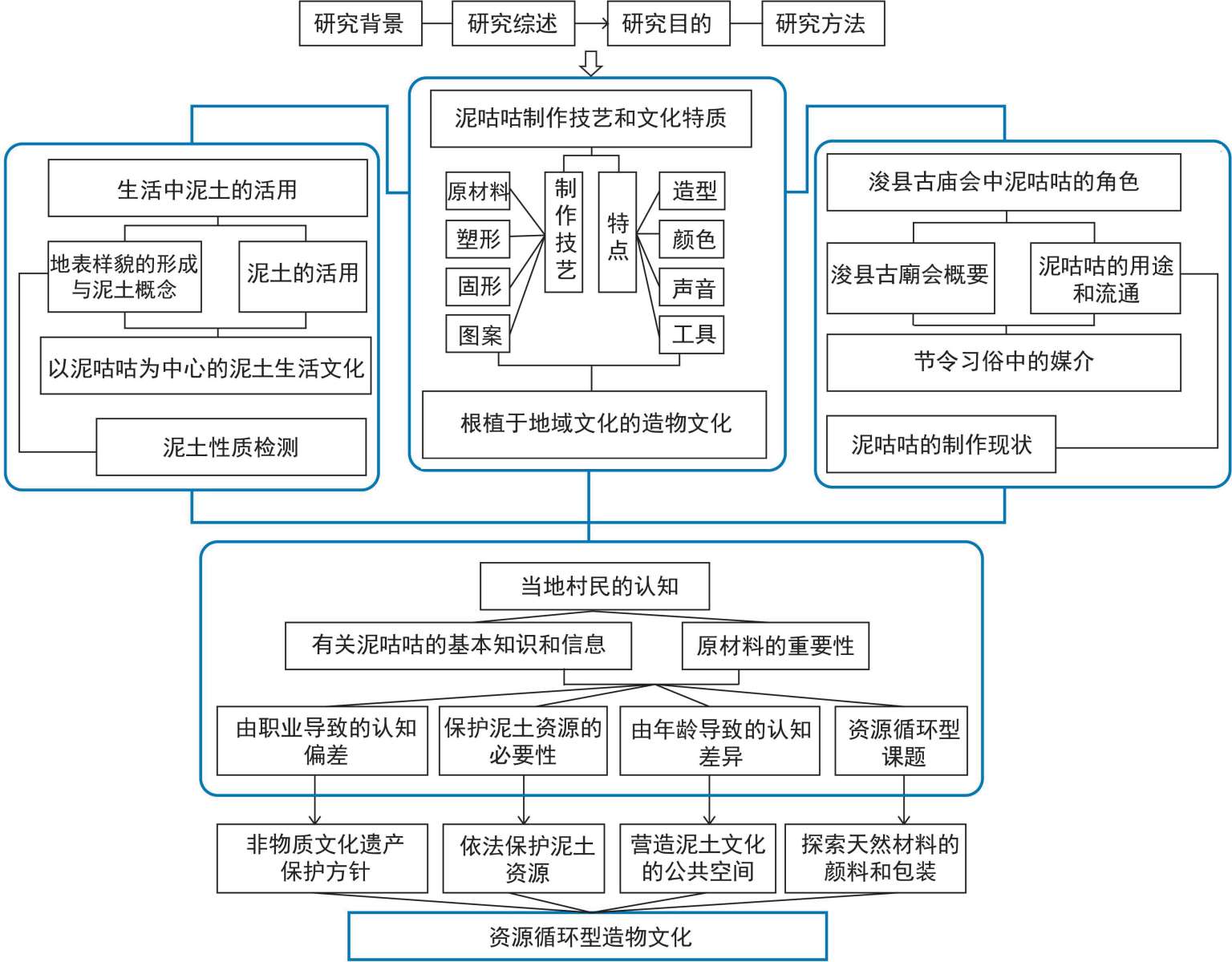 本研究借鉴民俗学领域典型的民族志方法,综合设计学的分析手段,主要采用文献调查、实地调查、参与观察法、个体访谈和问卷调查设计研究框架(见图1-1)。研究初始不提出假设;结论的得出通过系统、全面的观察和参与,历时较长,研究集中于个案,调研人员带着问题获取一手资料,调查所获得的资料包括现场感性认识的文字资料,主要采用定性分析和投入理解进行资料分析。具体而言,采用以下步骤: