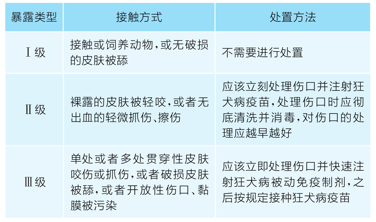 狂犬病暴露后预防处置是目前预防狂犬病发生最有效的手段之一,世界卫生组织明确指出,及时、科学和彻底的暴露后预防处置能够有效避免狂犬病的发生。目前我国狂犬病暴露分级如表1-1所示。