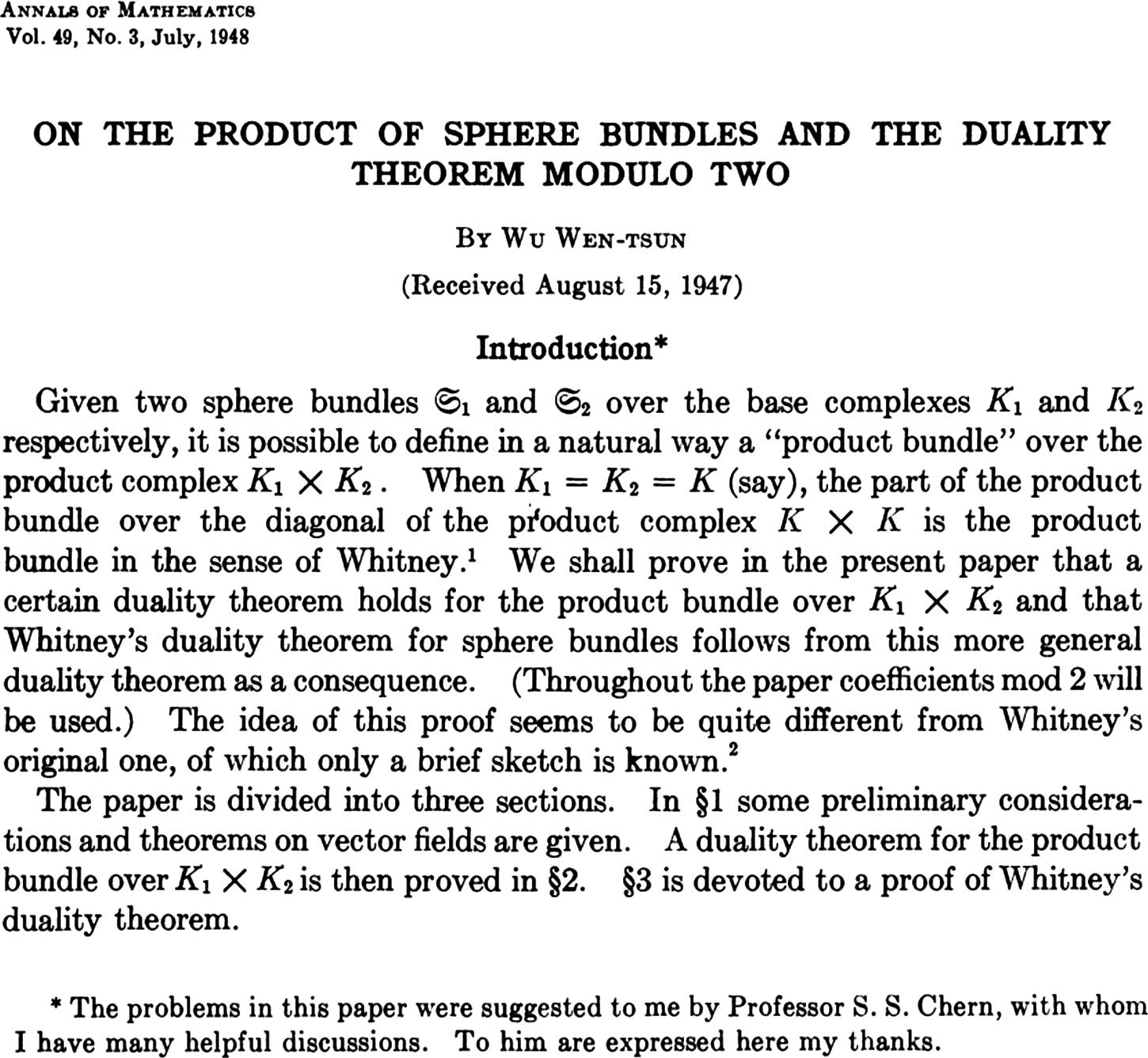 吴文俊发表在《数学年刊》的论文,下方(*)特别向陈省身表示感谢