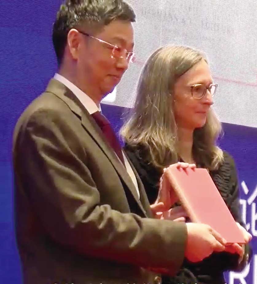 白安雅教授(右)向上海交通大学赠送吴文俊的博士论文,左为上海交通大学数学科学学院院长李丛明教授