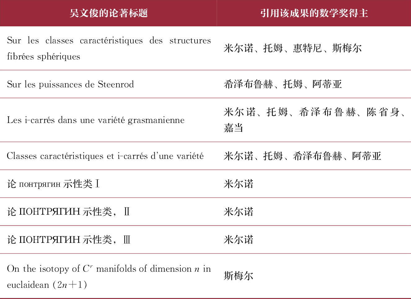 吴文俊在拓扑学研究领域发表的论文数量并不多,但对拓扑学的发展产生了深刻的影响,一些国际重要数学奖得主多次引用吴文俊的成果。据统计,共有8位重要数学奖得主引用了吴文俊的研究成果,其中菲尔兹奖得主有约翰·米尔诺(John Milnor,1931— )、托姆、史蒂芬·斯梅尔(Stephen Smale,1930— )、迈克尔·阿蒂亚(Michael Atiyah,1929—2019),阿贝尔奖得主有阿蒂亚、米尔诺,沃尔夫数学奖得主有陈省身、弗里德里希·希泽布鲁赫(Friedrich Hirzebruch,1927—2012)、米尔诺、斯梅尔、嘉当。