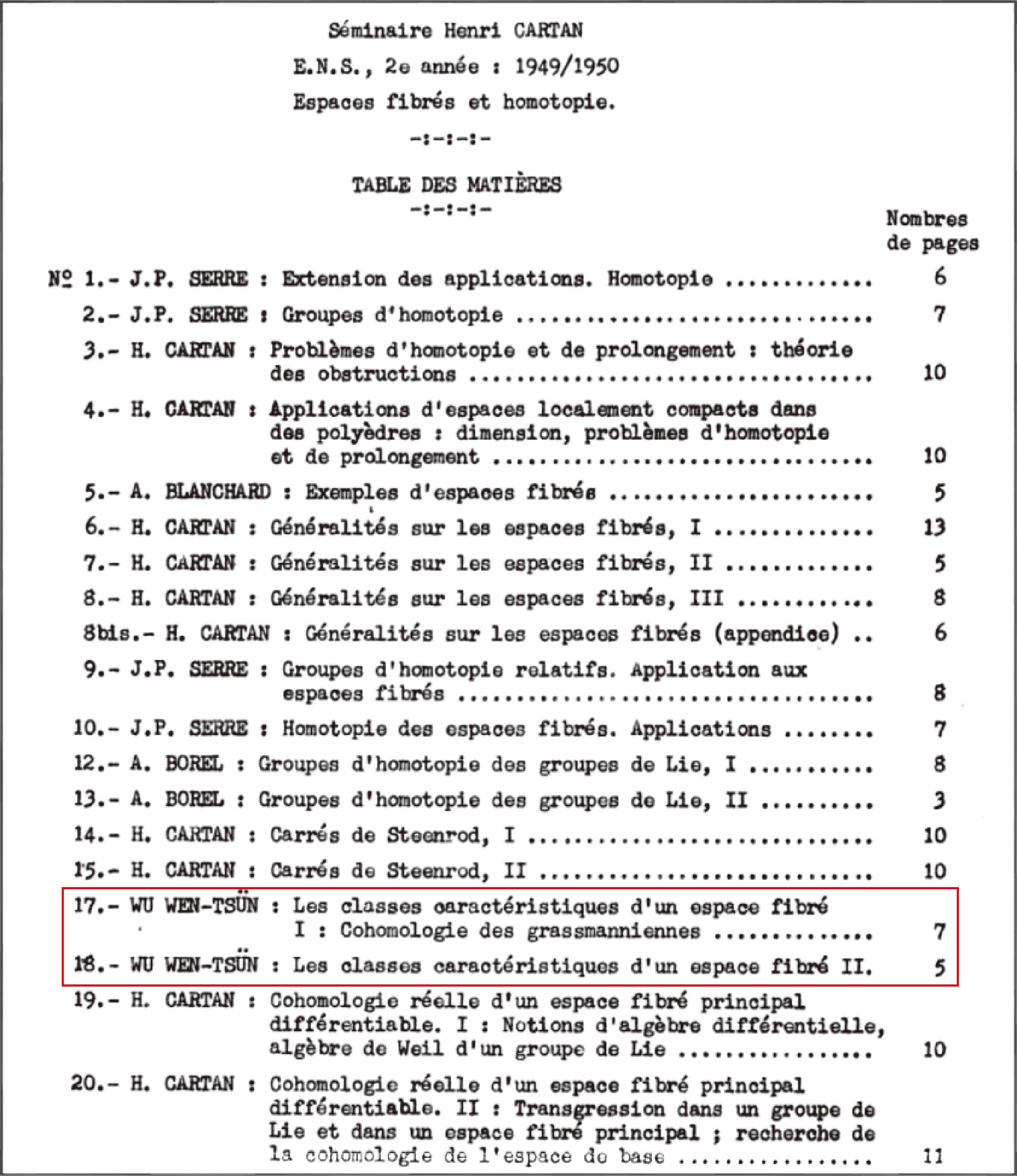 1948年年末起,讨论班的主题集中在代数拓扑。1949年秋,吴文俊师从嘉当,积极参加嘉当的讨论班。嘉当接受了塞尔的建议,把在讨论班报告的论文结集出版( Séminare Henri Cartan ),从1948年到1964年,共出版了16卷。 [1] 吴文俊的报告刊登在第2卷,主题是“纤维空间的示性类:格拉斯曼上同调”,共分2次。这是吴文俊参加“嘉当讨论班”的真实记录。