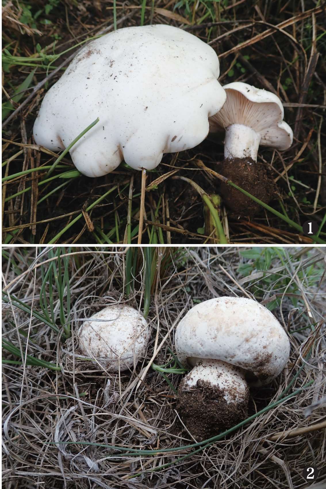 识别特征 担子果白色,干后略呈淡黄色,肉质;菌肉肥厚,白色,组织排列紧实,有特殊的香味。菌盖直径3~16 cm,幼时半球形,光滑,逐步向圆形过渡,成熟时菌盖平展,成熟后期菌盖表面常呈现裂状纹路。菌柄粗壮,白色,长3~6 cm,粗1~4 cm,中实,基部膨大达4~8 cm,膨大处往往呈现出不规则的三棱体结构。菌褶白色,密,弯生,不等长;孢子印白色。子实层无囊状体,孢子无色,呈不规则的椭圆形,大小在(5.5~8.5)μm×(3~4)μm。常以蘑菇圈的形式在草原上生长,是蒙古高原的特有种(鲁铁,2018)。