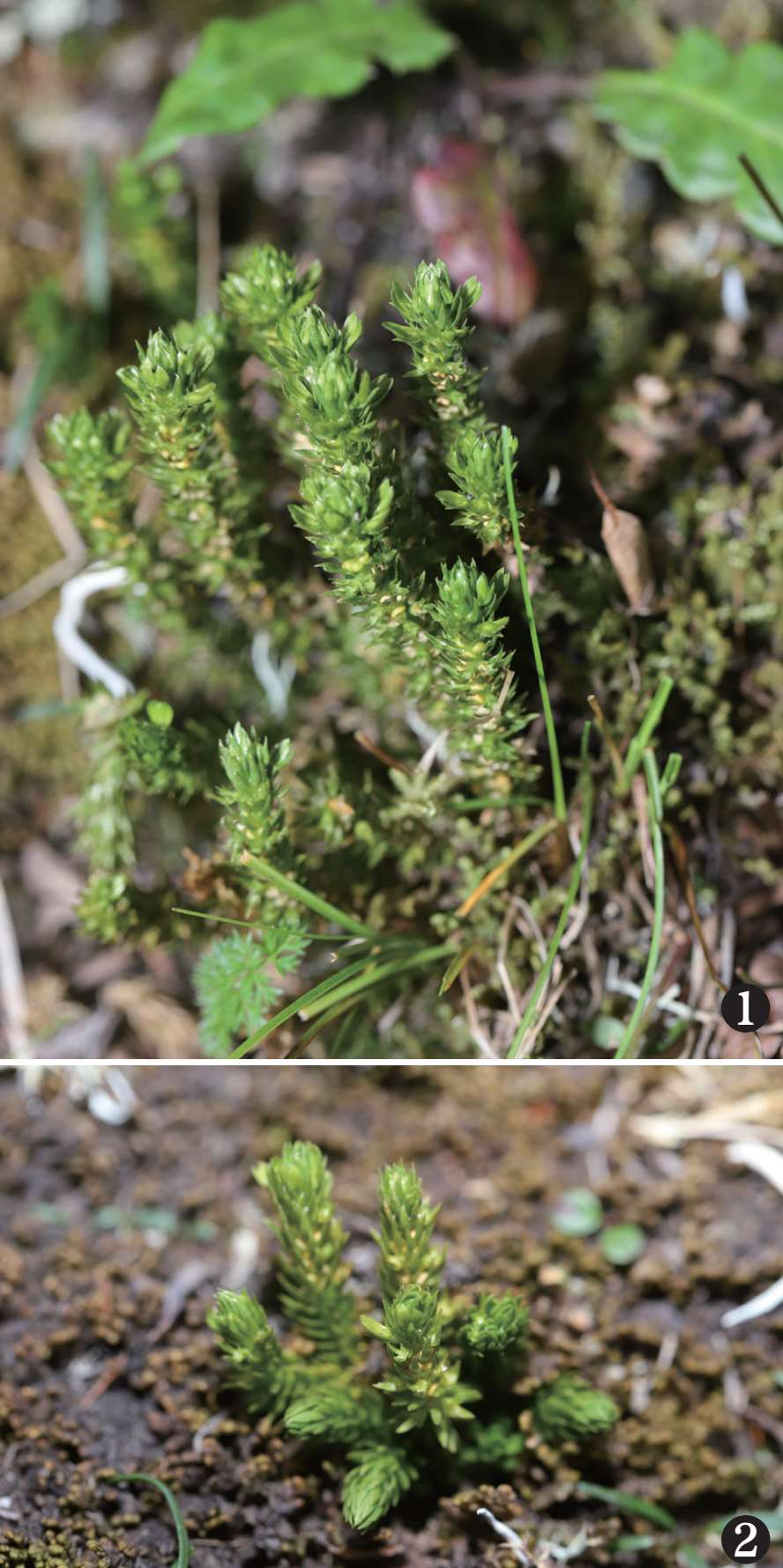 识别特征 多年生草本,茎直立或斜生,高10~16 cm,2~4回二叉分枝,枝上部常有芽胞。叶螺旋状排列,疏生,平展,披针形,向基部不变狭,基部最宽,通直。叶长4~6 mm,基部截形,宽约1.2 mm,无柄,先端渐尖,边缘平直不皱曲,全缘,两面光滑,无光泽,中脉不明显,草质。孢子叶与不育叶同形。孢子囊生于孢子叶叶腋,两侧略露出,肾形,黄色。