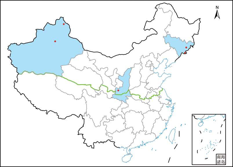 地理分布 吉林 白山(长白)、延边(安图); 陕西 宝鸡(眉县); 新疆 阿勒泰(阿勒泰)、乌鲁木齐(天山)(张丽兵 等,1998)。
