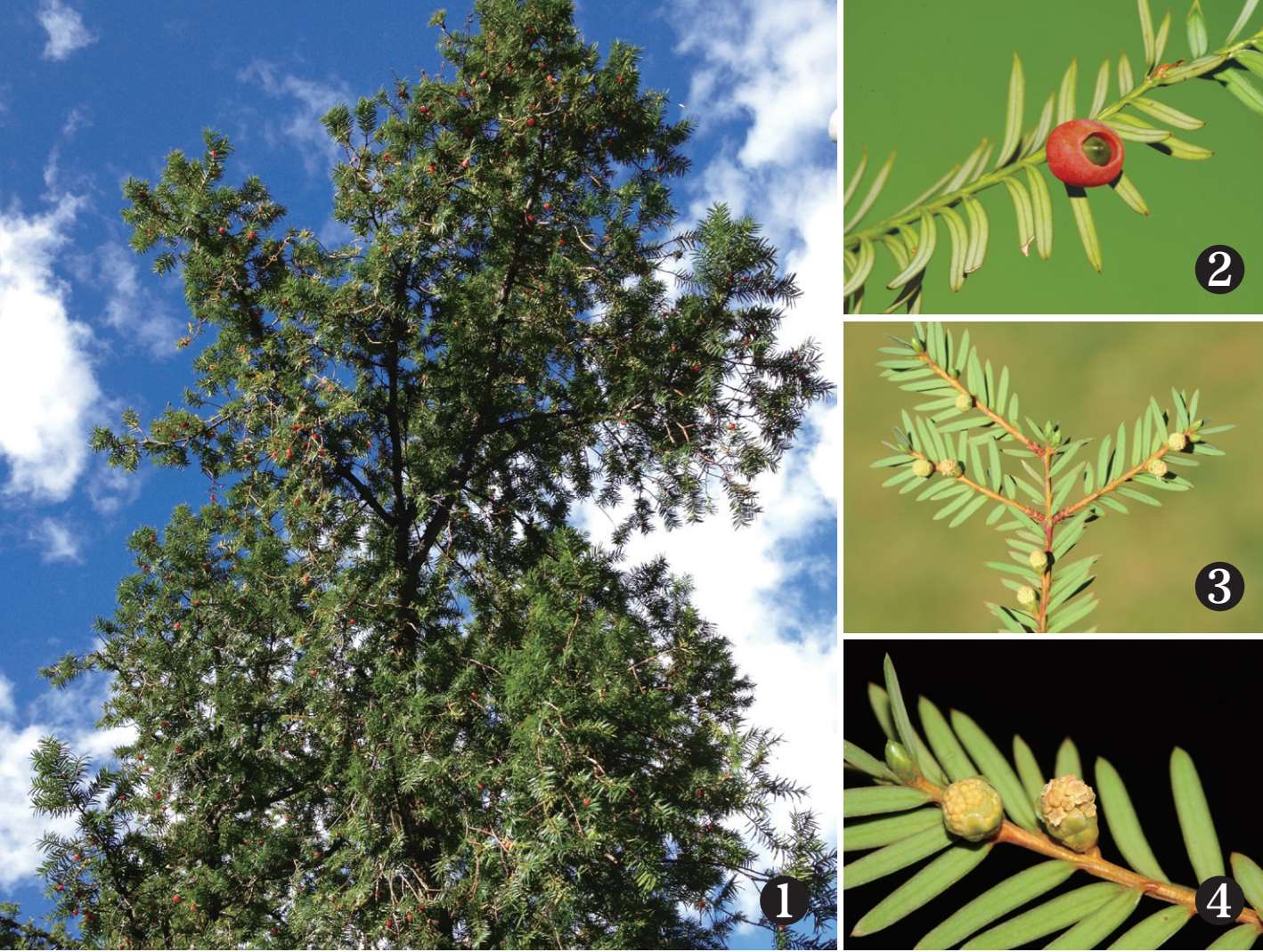 1. 常绿乔木或大灌木;2. 种子生于肉质杯状的假种皮中,柱状矩圆形,成熟时假种皮红色;3、4. 叶条形,排成彼此重叠的不规则两列,球花单生叶腋。