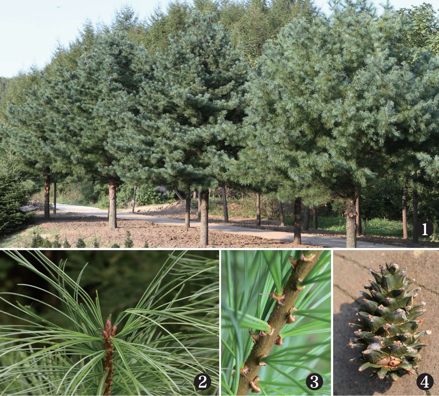 1. 高大乔木;2. 针叶5针一束,边缘具细锯齿;3. 叶鞘早落;4. 成熟后球果。