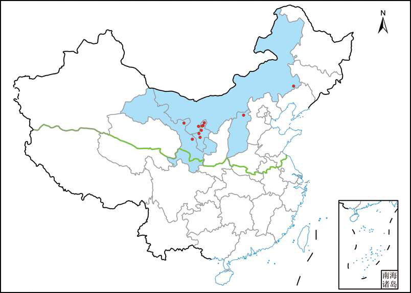 地理分布 内蒙古 阿拉善(阿拉善左)、通辽(科尔沁左翼后); 山西 大同(阳高); 甘肃 白银(靖远)、武威(民勤); 宁夏 石嘴山(平罗)、吴忠(青铜峡、同心)、银川(贺兰、西夏)、中卫(中宁)(刘哲荣,2017;刘哲荣 等,2019;张燕燕 等,2020;师斌 等,2022)。