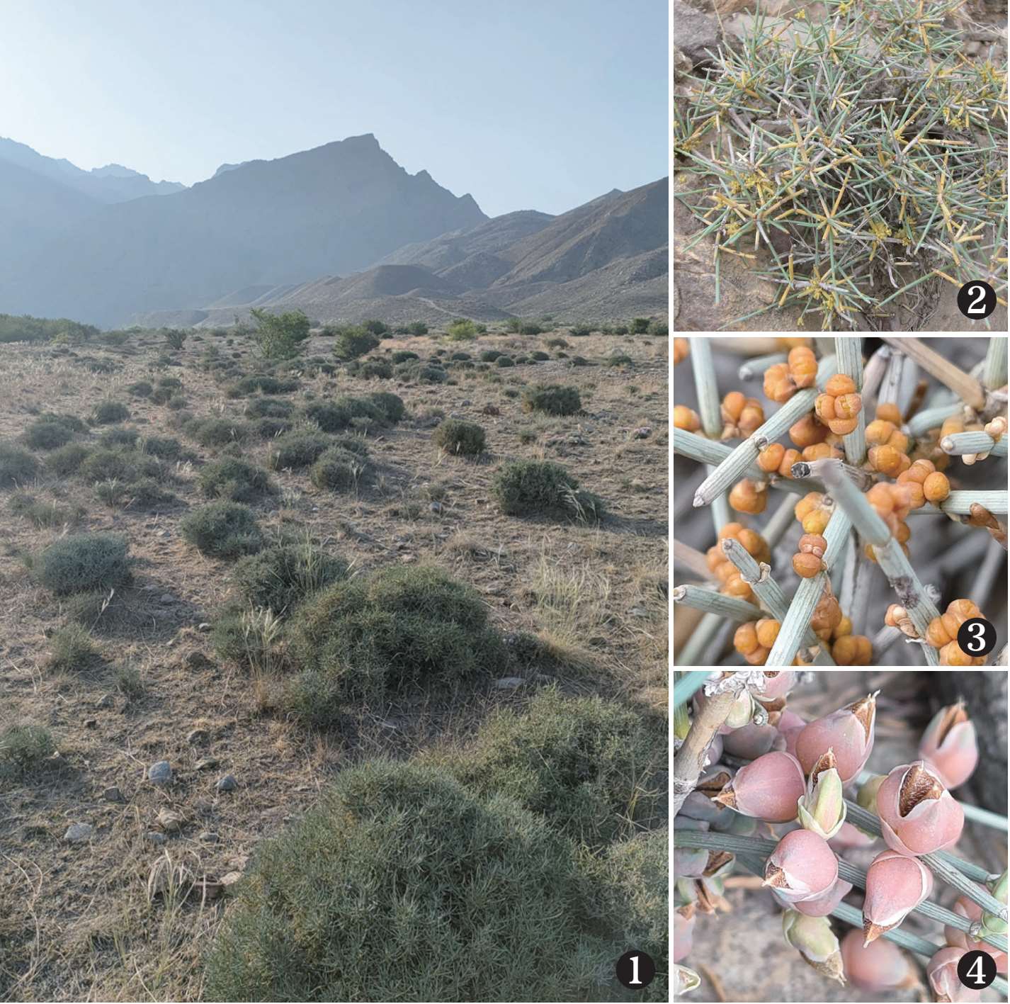 识别特征 矮小垫状灌木,高5~15 cm。枝节膨大、坚硬,小枝极细短。叶2裂,裂片宽三角形,先端微盾或稍尖。雄球花在节上对生,无梗,苞片2~3对;假花被倒卵圆形,雄蕊5~8枚,花丝全部合生,约1/2伸出假花被之外;雌球花单生,苞片常2对,雌花2,胚珠外围的假花被粗糙。种子2,较苞片长,背部中央及两侧边缘有整齐、明显的凸起纵肋,表皮有横列碎片状细密凸起。