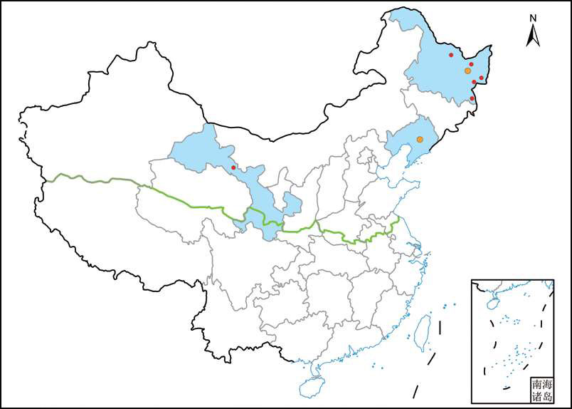 地理分布 黑龙江 鸡西(虎林、密山)、佳木斯(富锦)、牡丹江(东安、东宁)、双鸭山; 辽宁 鞍山; 甘肃 张掖(甘州)(茹剑 等,2013)。