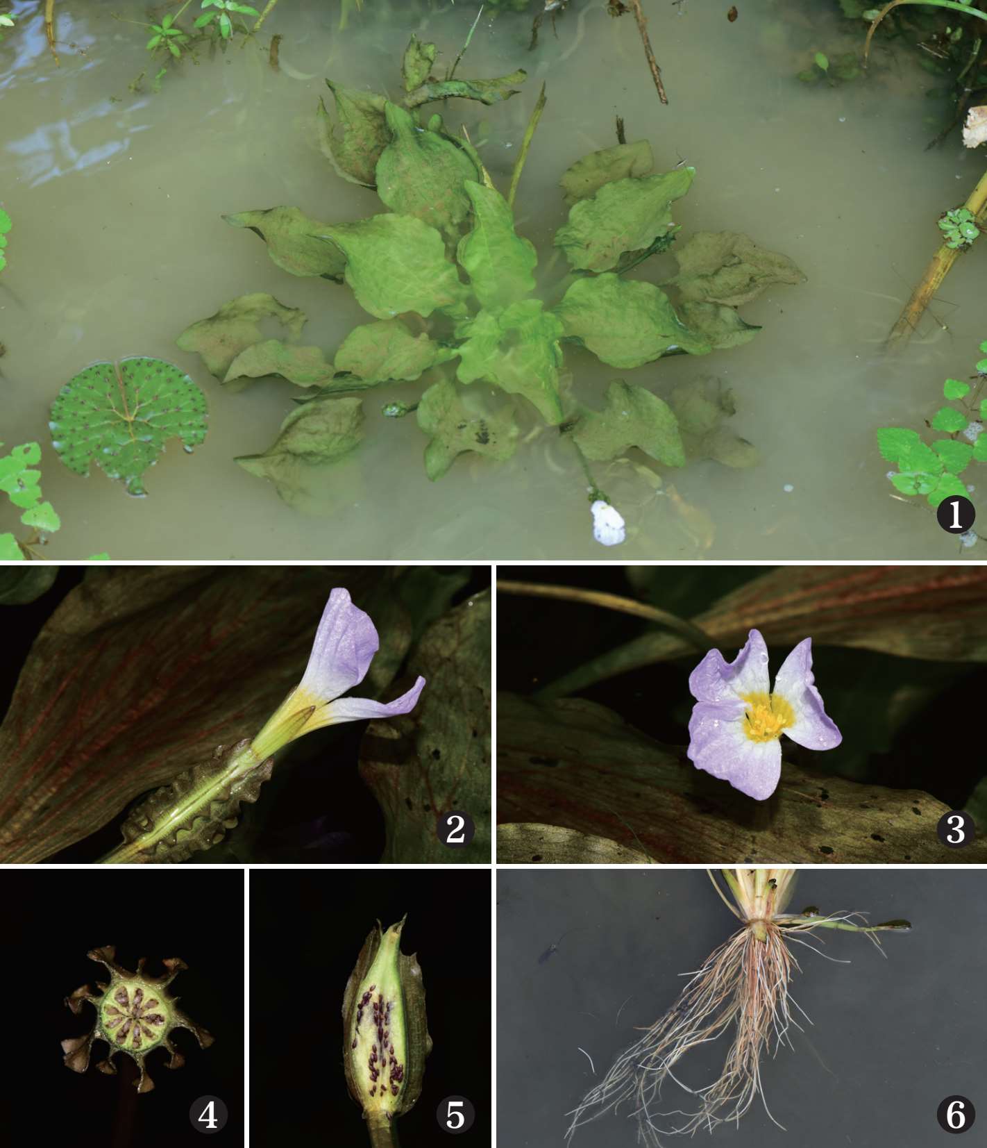 识别特征 一年生沉水草本,具须根。短茎或无茎。叶基生,叶柄长度随水的深浅变化大;幼叶无叶柄,线形至倒卵形;成熟叶有叶柄,叶片狭椭圆形至宽卵形。苞片顶端2裂,具5~6纵翅;花两性,偶单性,无梗,单生于苞片内;内外轮花被片各3,外轮花被片绿色;内轮花被片颜色多变;空气中授粉,果实水中成熟;雄蕊6~15枚,花丝具腺毛,花药条形,药隔扁平;子房下位,具短喙,与苞片等长,花柱6~10,2深裂。果与苞片等长。种皮有纵条纹,被白毛。