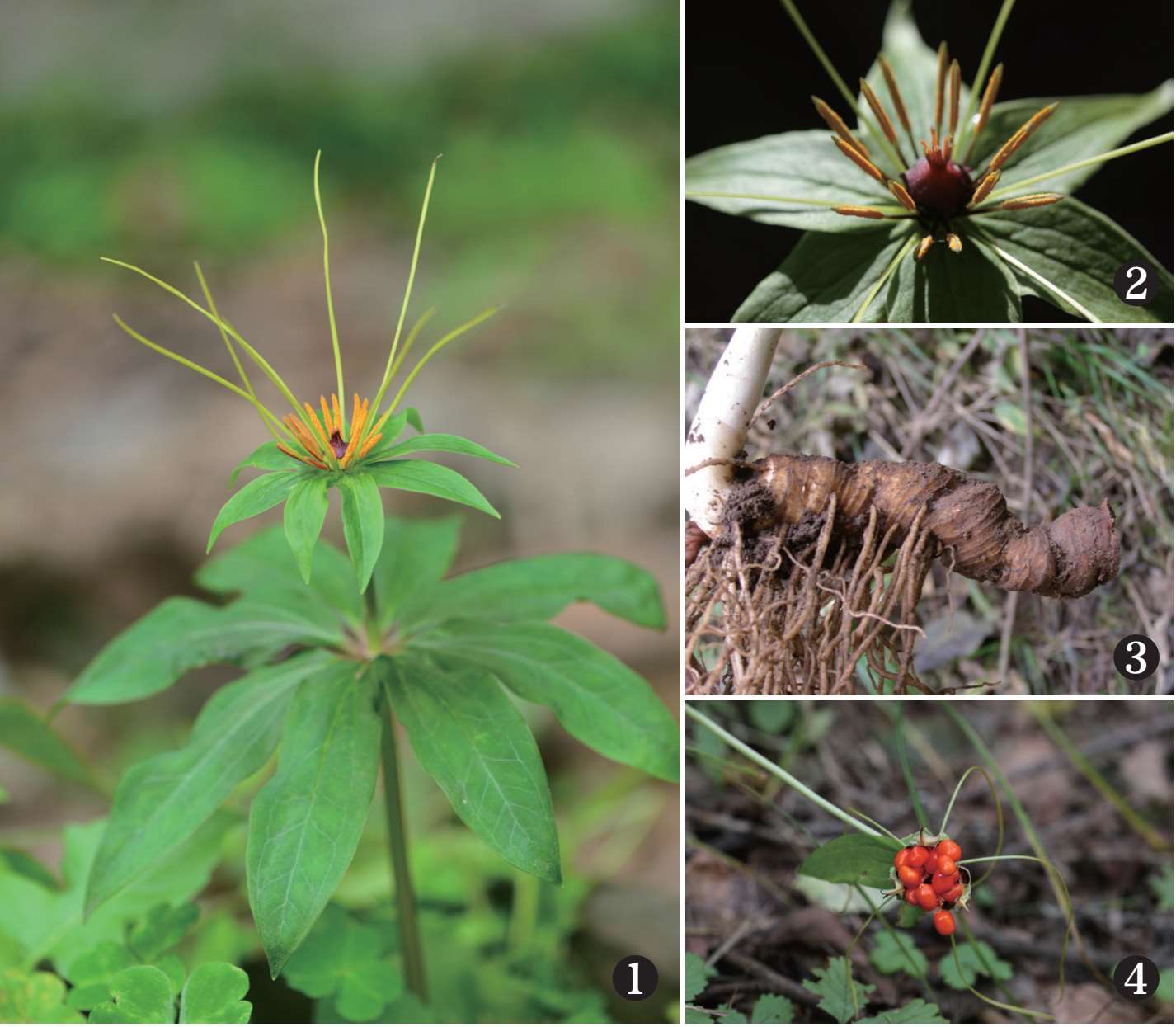 识别特征 多年生草本。根状茎粗厚,棕褐色,密生多数环节和许多须根。茎通常紫红色,基部有灰白色干膜质的鞘1~3枚。叶(5~)7~10枚,椭圆形或倒卵状披针形,先端渐尖,基部宽楔形;叶柄明显,带紫红色。外轮花被片绿色,(3~)4~6枚,狭卵状披针形;内轮花被片狭条形,通常比外轮长。雄蕊8~12枚,花药短,与花丝近等长。子房近球形,具棱,顶端具一盘状花柱基;花柱粗短,具4~5分枝。蒴果紫色,3~6瓣裂开。种子多数,具红色外种皮。