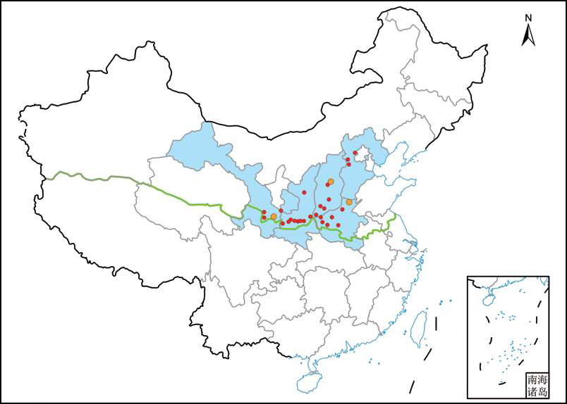 地理分布 河北 保定(涞源)、张家口(怀来、蔚县); 河南 安阳、焦作(修武)、洛阳(栾川、宜阳)、平顶山(鲁山)、三门峡(灵宝、卢氏); 山西 临汾(安泽)、吕梁(交城)、太原、运城(垣曲、芮城、夏县); 陕西 宝鸡(凤县、眉县、太白)、渭南(华阴)、西安(长安、鄠邑、蓝田、周至)、延安(安塞); 甘肃 定西(岷县、漳县)、平凉(华亭)、天水。
