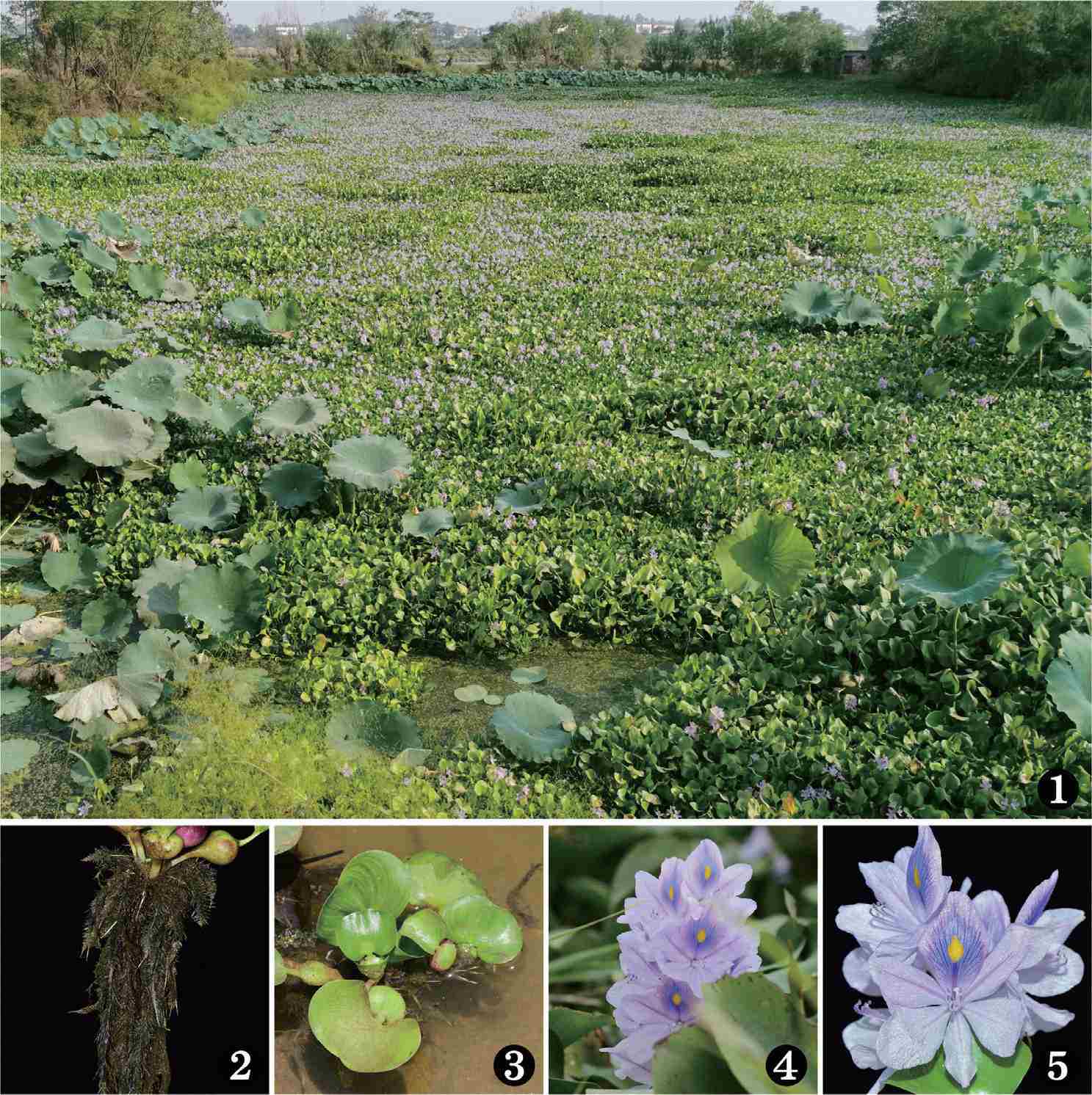 1. 生于池塘、湖泊、运河、沟渠等水生环境;2. 须根发达,棕黑色,茎极短;3. 叶基生成莲座状,叶片宽卵形,具弧形脉叶柄中部膨胀成囊状,内有气室,基部有鞘状苞片;4、5. 穗状花序,花被片蓝紫色,花冠两侧对称,上方1枚裂片,四周淡紫红色,中间蓝色,内有1黄色斑点,形如“凤眼”,雄蕊6枚,3长3短,贴生于花被筒上。