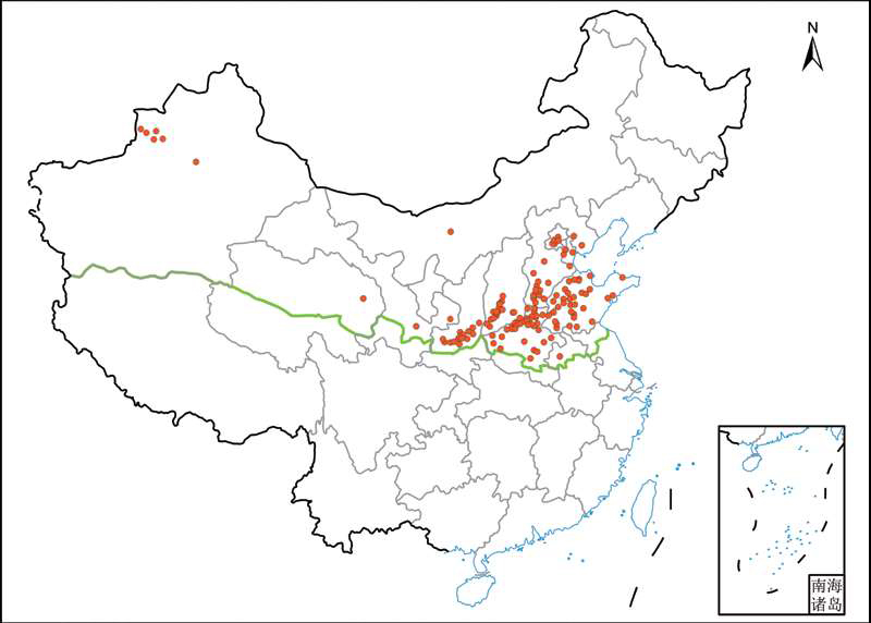 北方分布记录及国内其他分布 内蒙古: 巴彦淖尔; 山东: 滨州(无棣、阳信、邹平)、德州(乐陵、宁津、平原、禹城)、东营(广饶、河口)、菏泽(曹县、定陶、菏泽)、济南(长清、历下)、济宁(曲阜、微山、邹城)、聊城(茌平、东阿、冠县、临清、阳谷)、临沂、青岛(即墨、胶州)、泰安(肥城、宁阳、泰山、新泰)、烟台、淄博; 江苏: 徐州(丰县); 河北: 保定、沧州(盐山)、邯郸(丛台、馆陶、邯山、鸡泽、临漳、曲周、永年)、衡水(枣强)、唐山(曹妃甸、玉田)、石家庄(正定)、邢台(隆尧、南和、宁晋、平乡、任泽); 天津: 北辰、滨海、静海; 京: 大兴、房山、海淀、顺义、通州; 安徽: 阜阳(颍州); 南: 安阳(北关、滑县、林州、汤阴、殷都)、鹤壁(浚县、淇县)、焦作(博爱、孟州、沁阳、温县、武陟)、开封(兰考)、洛阳(涧西、栾川、偃师)、濮阳(范县、濮阳、台前)、三门峡(灵宝、卢氏、渑池)、商丘(虞城、柘城)、新乡(长垣、封丘、凤泉、获嘉、卫辉、辉县、新乡、延津、原阳)、许昌、郑州(巩义)、周口(淮阳、商水、项城)、驻马店(遂平); 山西: 晋城(城区、泽州)、临汾(洪洞、侯马、霍州、曲沃、襄汾、尧都、翼城)、运城(稷山、临猗、芮城、闻喜、夏县、新绛、盐湖、永济); 陕西: 宝鸡(眉县、岐山)、铜川、渭南(澄城、大荔、富平、韩城、临渭、蒲城)、咸阳(泾阳、三原、武功、兴平)、西安(长安、高陵); 肃: 庆阳(宁县)、天水; 青海: 西宁; 新疆: 伊犁(巩留、霍城、尼勒克、新源、伊宁)、巴音郭楞(和静)。