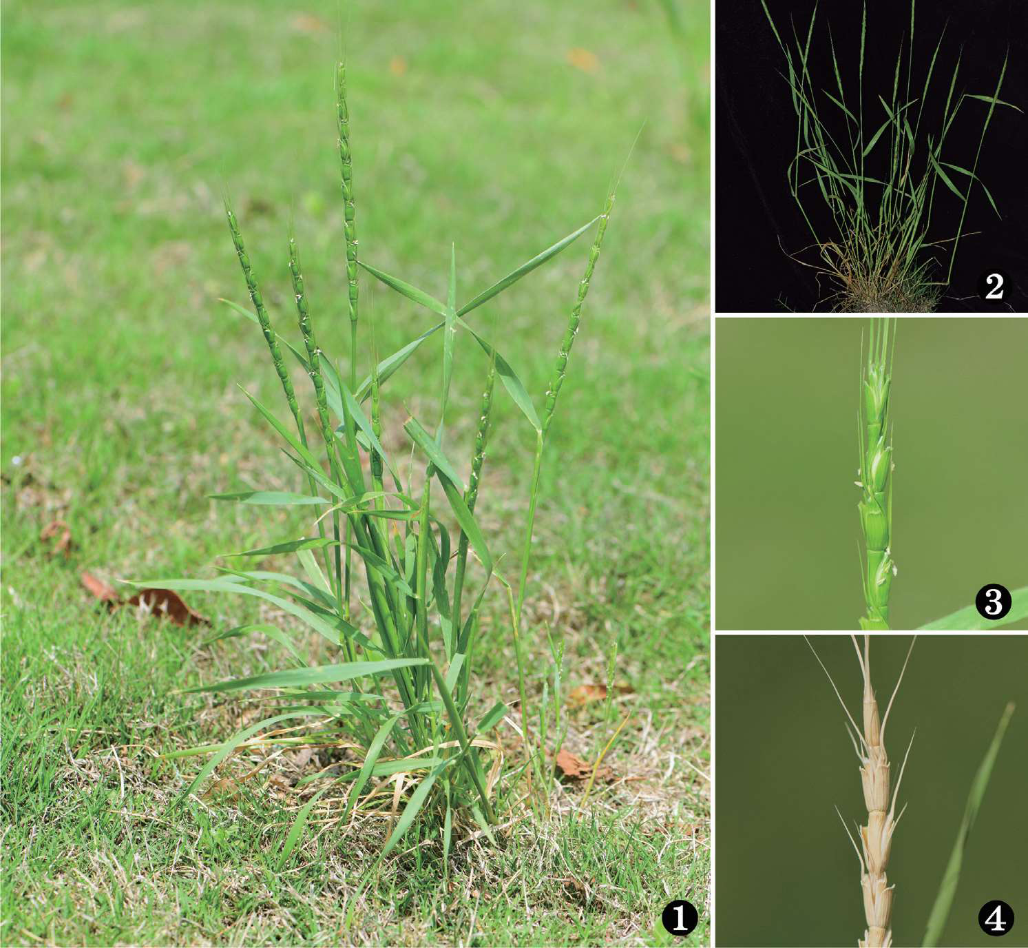 1. 一年生草本;2. 茎秆丛生,叶鞘包茎,无毛,叶片上面疏被柔毛;3. 穗状花序圆柱形,具7~10小穗;4. 小穗圆柱形,嵌于穗轴凹陷内,熟时变黄。