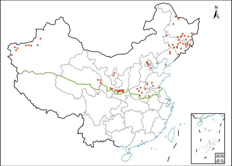 北方分布记录及国内其他分布 黑龙江: 哈尔滨(阿城、方正、尚志、延寿)、黑河(爱辉、五大连池、逊克)、牡丹江(东宁、林口、穆棱、宁安)、鸡西(密山); 吉林: 白城(镇赉)、白山(抚松)、长春(公主岭)、吉林(蛟河、磐石、舒兰、永吉)、辽源、四平(双辽)、通化(辉南、集安)、延边(安图、敦化、和龙、珲春、汪清、延吉); 辽宁: 大连、辽阳(灯塔)、沈阳; 山东: 济宁(微山、兖州)、菏泽(牡丹); 江苏: 连云港(海州); 北: 秦皇岛; 天津: 滨海; 北京: 昌平、丰台、海淀、延庆; 安徽: 阜阳(颍上); 河南: 开封、商丘、许昌、郑州(新密)、周口、驻马店; 陕西: 宝鸡(凤翔、扶风、眉县)、渭南、西安(高陵、蓝田、临潼)、咸阳(泾阳、礼泉、乾县、武功、三原、兴平); 甘肃: 天水(甘谷、麦积、秦州); 宁夏: 银川、吴忠(青铜峡); 青海: 西宁(湟中)、海东(乐都、循化); 新疆: 阿克苏(拜城、温宿、乌什)、喀什(塔什库尔干)、克孜勒苏(阿合奇、阿克陶、阿图什、乌洽)、伊犁(巩留)。
