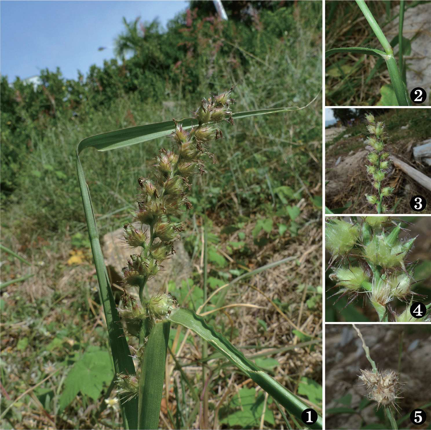 1. 一年生草本,生于农田、路边、荒地;2. 叶鞘松弛,压扁状具脊,叶舌短小,叶片狭长披针形,质较软;3. 总状花序直立;4. 刺苞扁圆球形,背部具较密的细毛和长绵毛,裂片于中部稍下处连合,基部收缩呈楔形,总梗密具短毛,刚毛在刺苞上轮状着生;5. 果实成熟后脱落。