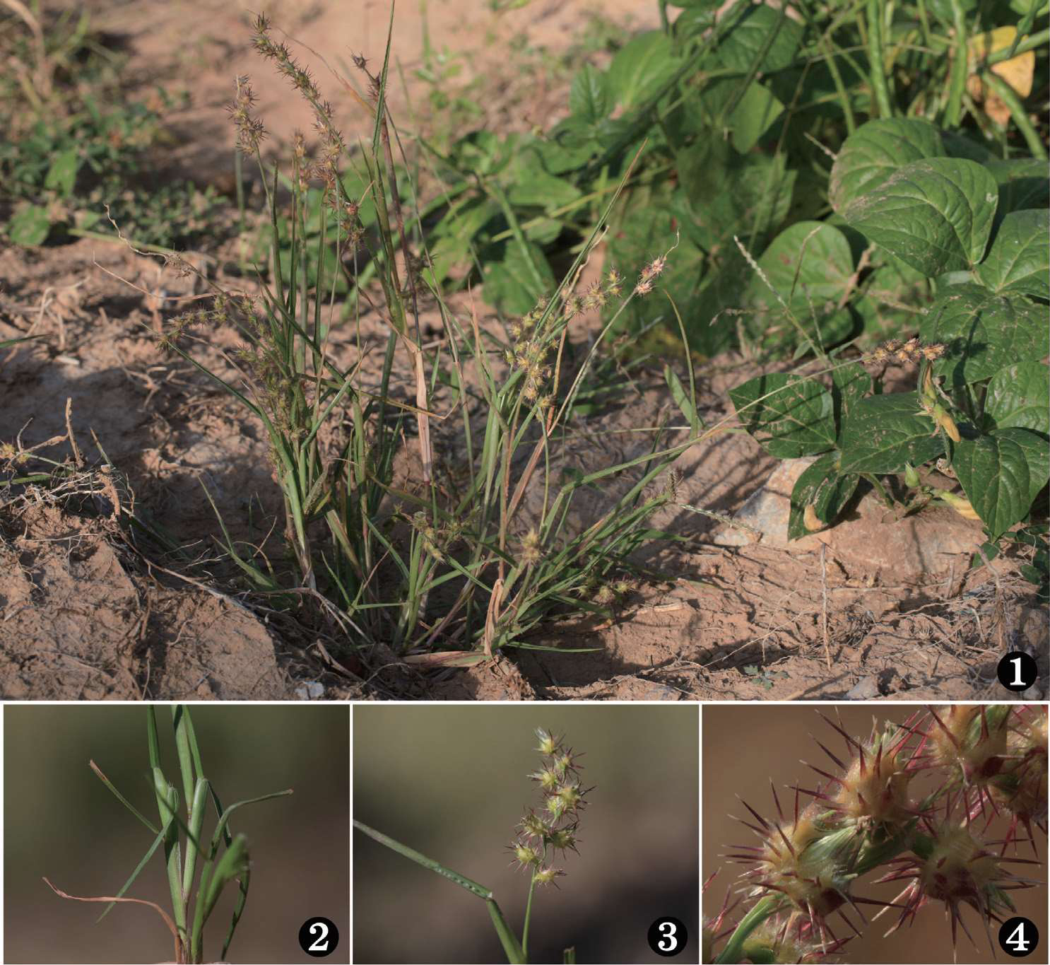 1. 一年生草本,基部分蘖,茎先横向匍匐生长,后直立生长;2. 叶鞘具脊,膜质,叶片线形或狭长披针形,干后常对折,两面无毛;3. 总状花序自叶鞘中部伸出,花序轴具棱;4. 刺苞稍长圆球形,近基部有1~2圈较细刚毛,上部刚毛粗壮,其基部较宽,呈尖三角形,刺苞外面具白色毛。