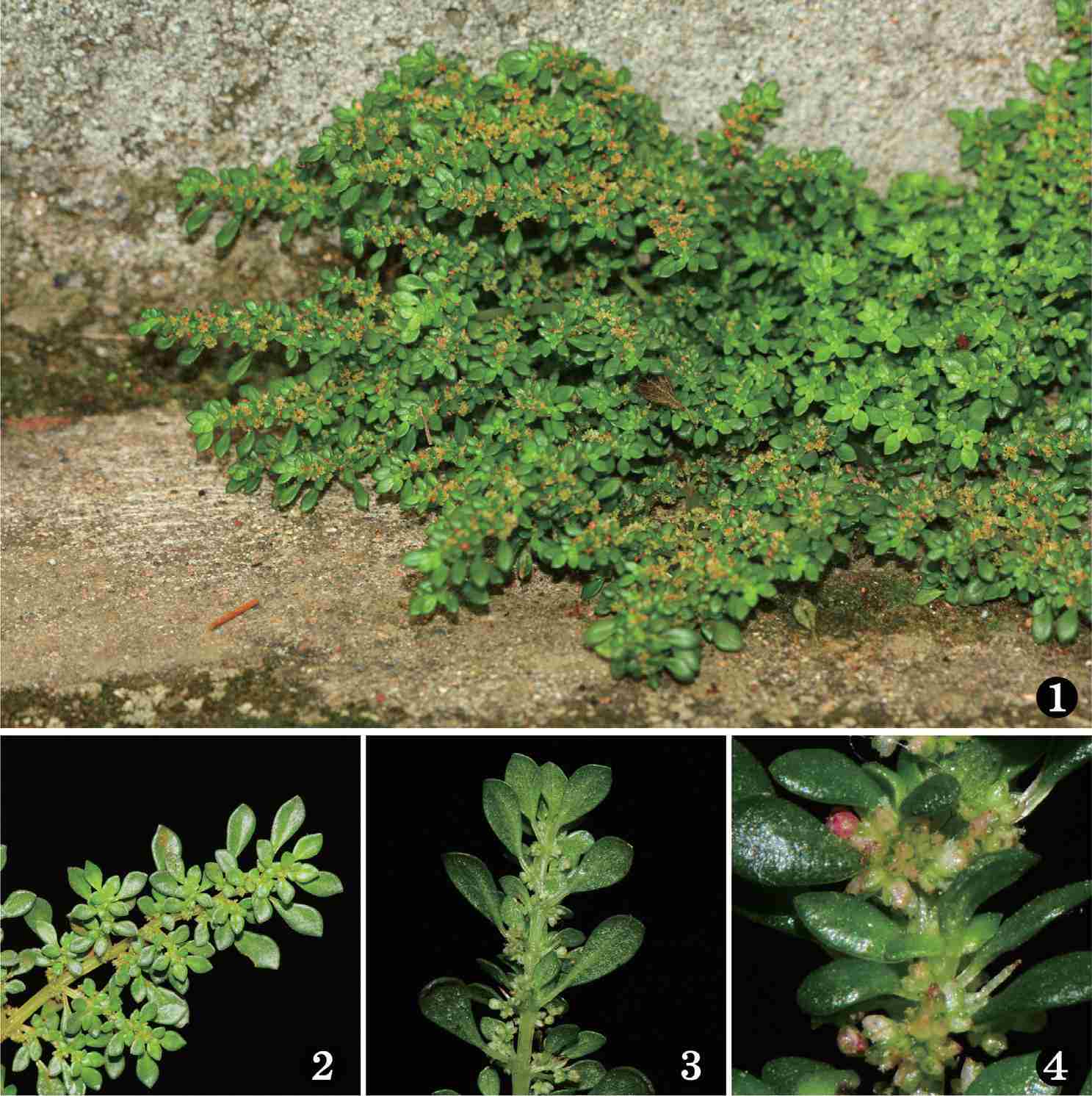 识别特征 一年生纤细草本。茎肉质,多分枝,无毛,密布线形钟乳体。叶同对的不等大,匙形,全缘。雌雄同株,聚伞花序密集成头状。瘦果卵圆形。