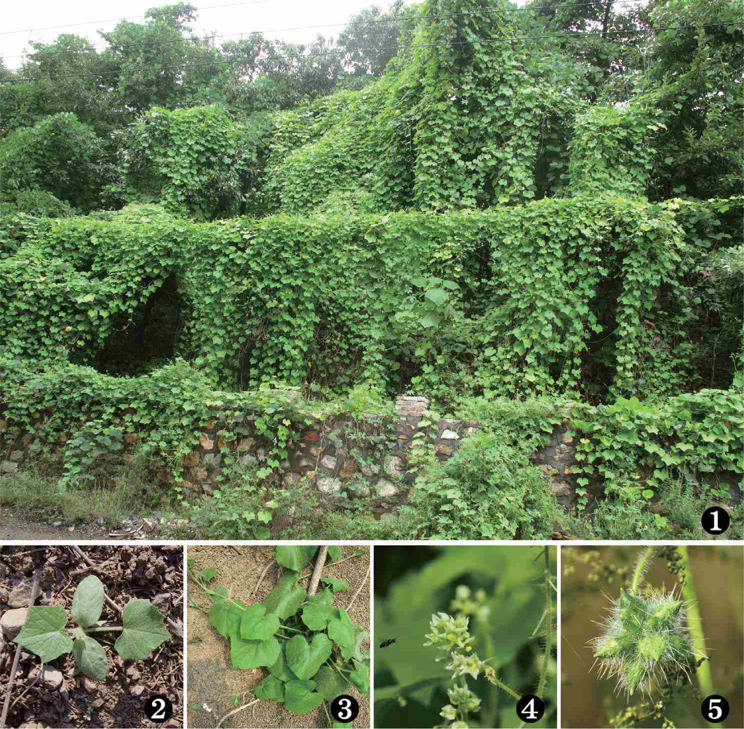 识别特征 一年生大型藤本。茎上具棱槽,密被白色柔毛,有卷须。叶片卵圆形,3~5浅裂。花雌雄同株,雄花排列成头状聚伞花序,花冠5裂,白色至浅黄绿色,裂片三角形;雌花较小,花暗黄色,无柄,聚成头状。果实长卵圆形,簇生,密被白色柔毛与黄褐色细长刺。