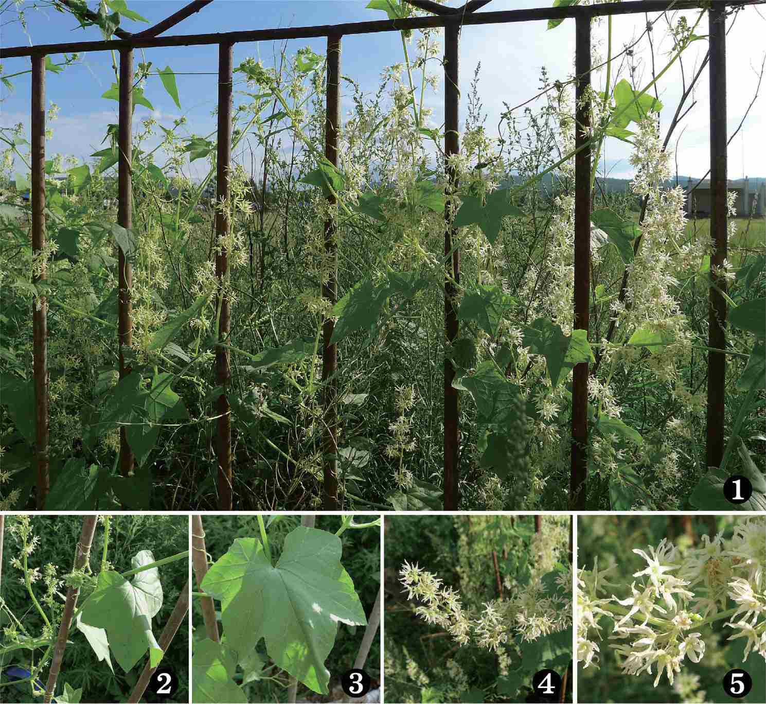 识别特征 一年生攀援草本,茎细,具棱槽。卷须2~5分叉。叶薄纸质,宽卵形,掌状5~7深裂或浅裂,两面被粗糙的小疣点。花雌雄同株,异序;雄花序窄圆锥形,雄花萼筒宽钟状,花冠辐状,6深裂,裂片白色,具明显的脉纹;雌花单生或与雄花序同生于叶腋,花萼与花冠同雄花。果卵球形,囊状,表面密生长皮刺,成熟时自顶端不规则开裂。种子椭圆形,黑褐色。