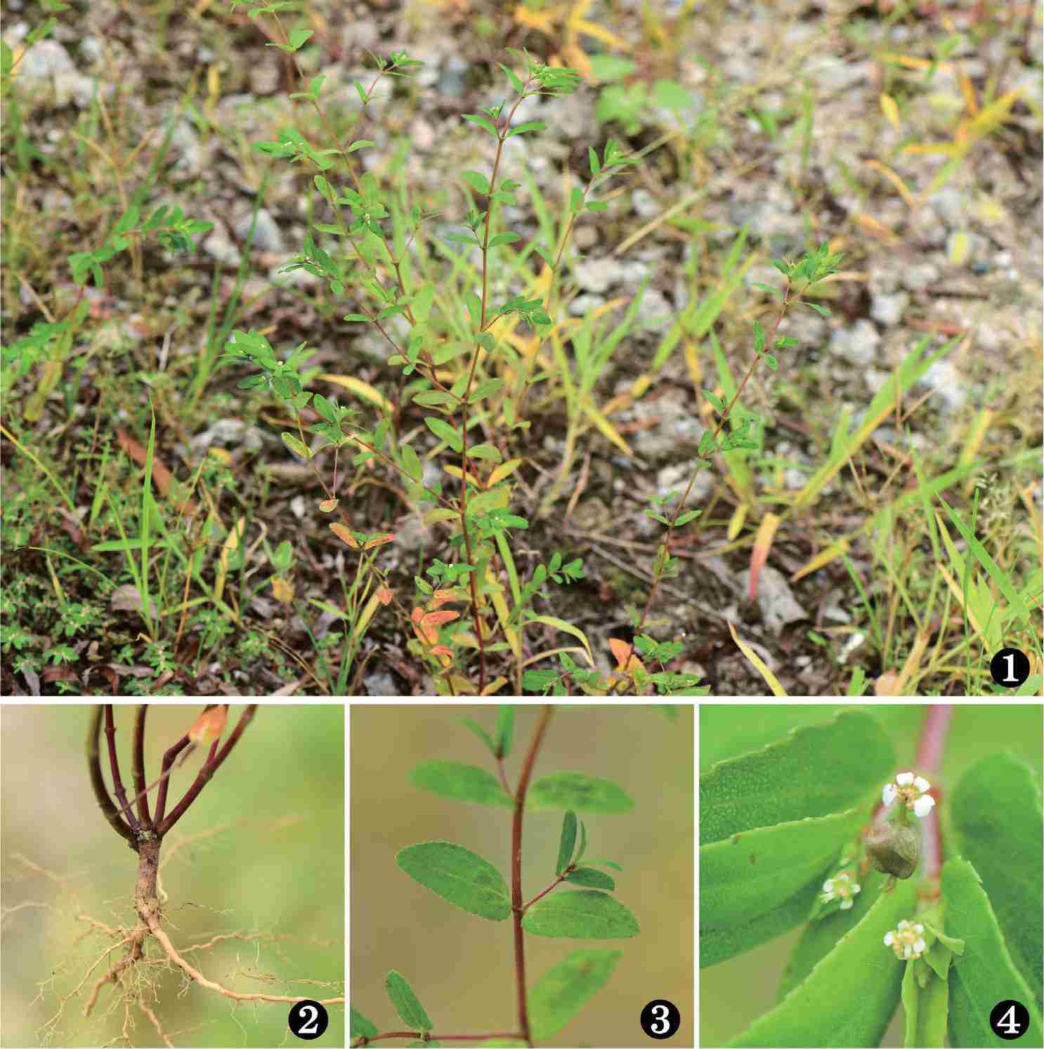 识别特征 一年生草本。茎直立,自基部分枝。叶对生,倒卵形,不对称,通常偏斜,两面被稀疏的柔毛;托叶三角形,分离或合生;苞叶2枚,与茎生叶同形。杯状聚伞花序簇生于叶腋或枝顶;雄花数枚,雌花1枚,子房柄长于总苞;子房三棱状,无毛;花柱3,分离;柱头2浅裂。蒴果三棱状;种子卵形具棱。