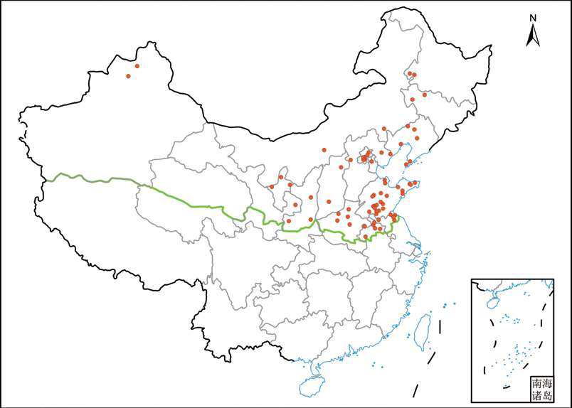 北方分布记录及国内其他分布 黑龙江: 齐齐哈尔(昂昂溪、龙江); 吉林: 白城(通榆)、松原(前郭尔罗斯); 辽宁: 鞍山(立山)、大连(金州、旅顺口)、阜新(彰武)、葫芦岛(连山)、沈阳(新民); 内蒙古: 赤峰(红山)、呼和浩特(土默特左); 山东: 东营(河口、垦利)、济南(天桥、长清)、济宁(金乡、曲阜、泗水、微山、兖州、邹城)、临沂(费县、蒙阴)、青岛(即墨、崂山、平度)、泰安(新泰)、威海、潍坊(临朐)、烟台(莱山、牟平)、枣庄(山亭、滕州)、淄博(周村); 江苏: 连云港(赣榆、灌云、连云、海州)、徐州(贾汪); 河北: 秦皇岛、唐山(迁西)、张家口(蔚县); 天津: 武清; 北京: 大兴、房山、海淀、门头沟、密云、顺义; 安徽: 亳州、阜阳、淮北、宿州(灵璧、萧县、埇桥); 河南: 济源、洛阳(伊川)、新乡(辉县)、许昌、郑州; 山西: 临汾(尧都)、忻州(繁峙); 陕西: 宝鸡、渭南、延安; 甘肃: 庆阳(西峰); 宁夏: 吴忠(盐池)、银川、中卫; 新疆: 克拉玛依、塔城(和布克赛尔)。