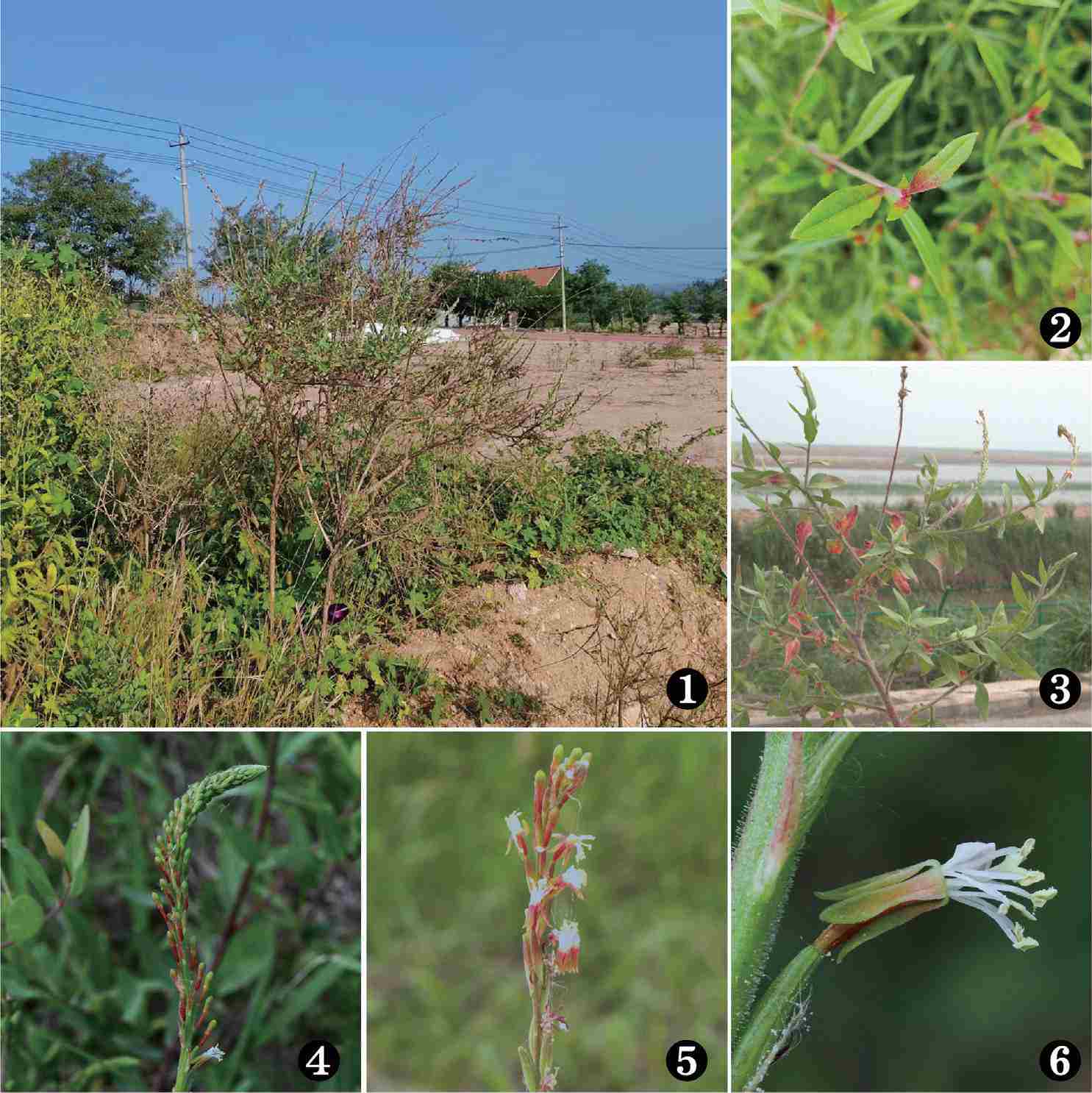 1. 一年生草本,生于农田、荒地、沟边;2. 茎生叶菱状卵形;3、4. 穗状花序,生茎枝顶端;5、6. 花筒带红色,反折,花瓣白色,开放后变红色,倒卵形。