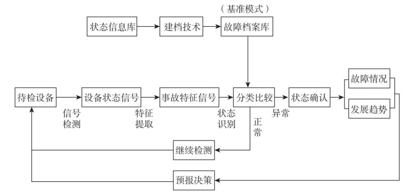 (4)预报决策。经过判别,对属于正常状态的可继续监视,重复以上程序;对属于异常状态的,则要查明故障情况,做出趋势分析,预测今后发展和可继续运行的时间,以及根据问题采取控制措施和维修决策。