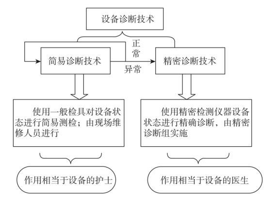 在一般情况下,多数印刷设备都采用简易诊断技术来诊断设备现时的状态。只有对那些在简易诊断中提出疑难问题的设备,才进行精密诊断。合理使用两种诊断技术,才是最有效而又最经济的。图3-2为简易诊断技术和精密诊断技术的功能。