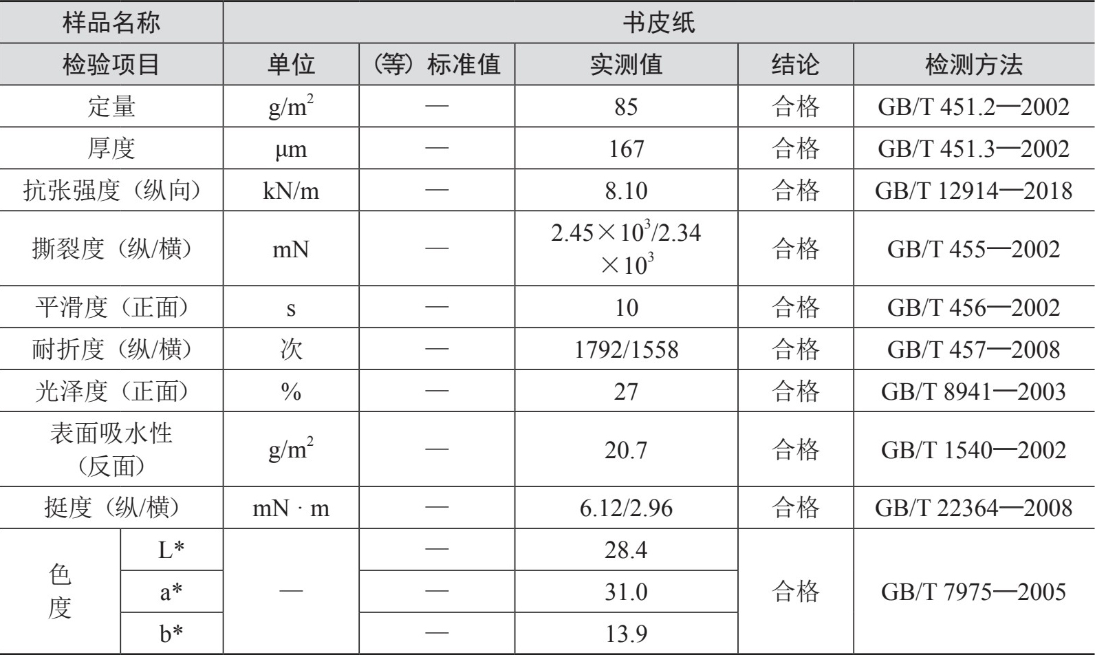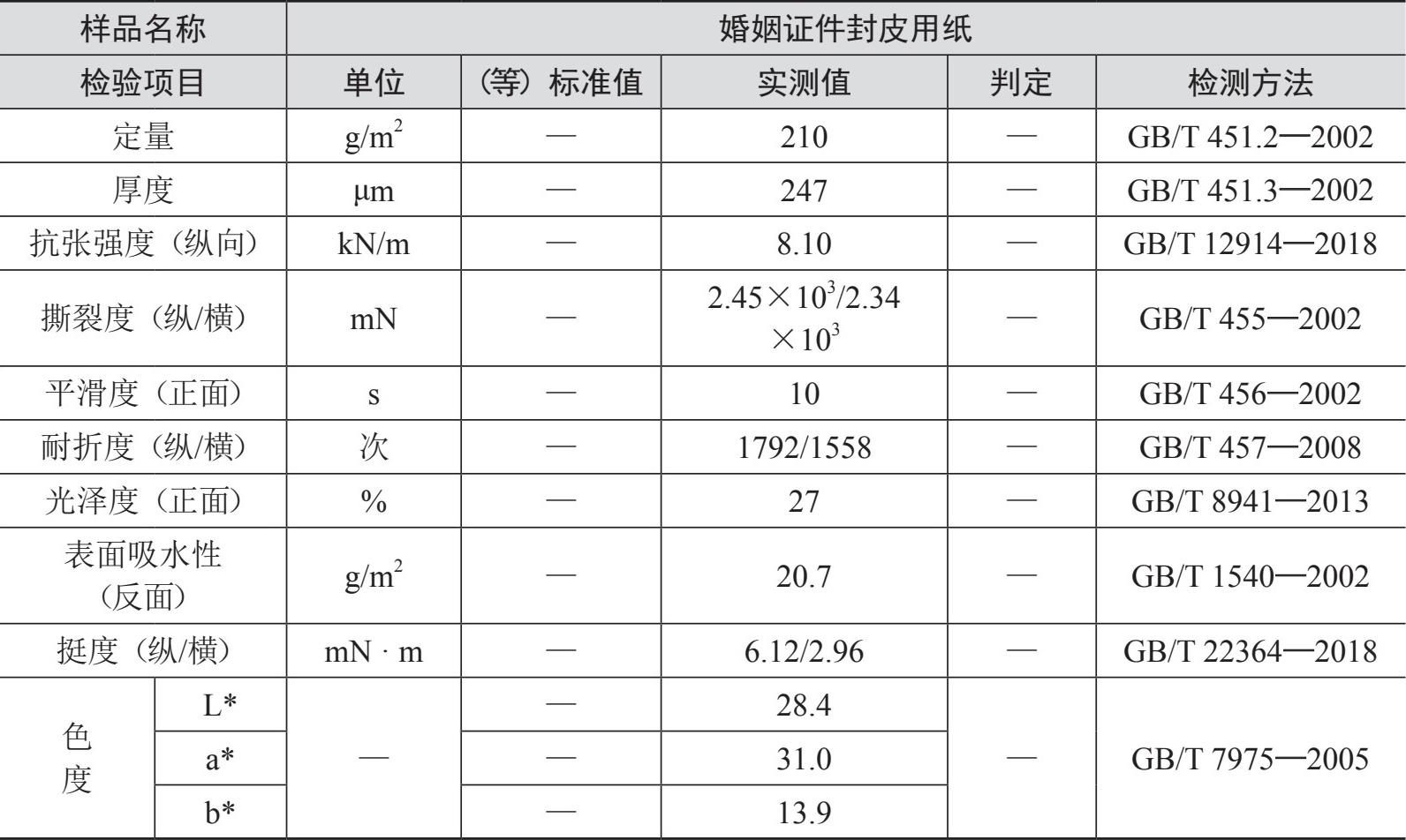 表1-1 高克重封皮用纸质量检验报告(主要部分)