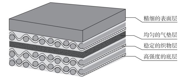 气垫橡皮布由表面胶层、气垫层、弹性胶层和织布骨架层组成,如图1-1所示。