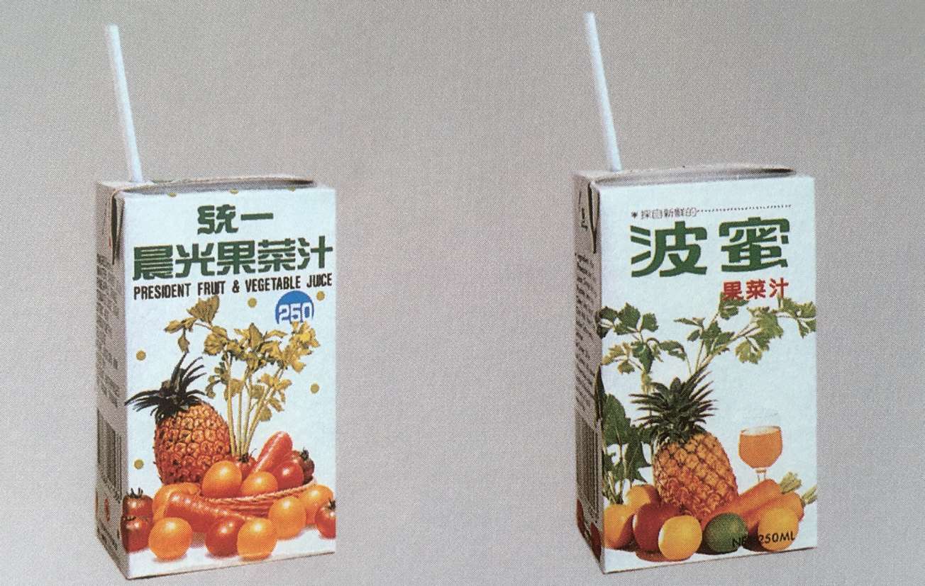 图1-2 消费者对果菜汁的包装印象,就是一堆蔬果、菠萝、芹菜等,每家的包装都用这些元素(同化),而为求种类的区别化,波蜜更新版的果菜汁包装,长期经营下来,自己树立了个体的区别化及识别化(异化)印象。