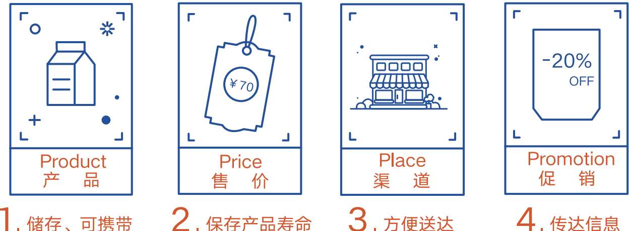在“实用功能”的部分它必须具备:产品“储存”及“可携带”的功能。存储的目的是在一个特定空间内保存产品,这样产品的概念才能形成,这就是营销4P中的第一个P“Product(产品)”。包装要能保护产品,使其不受气候、季节的影响,进而延长产品的保存寿命,这个步骤尤为重要,因为它主导产品的定量(内容物的容量),方能明确地反映出定价,这也就是营销4P中的第二个P“Price(售价)”。解决保护商品的方法后,就可以安全且方便地传递或运送商品到各地的卖场及渠道,这便是营销4P中的第三个P“Place(渠道或通路)”。