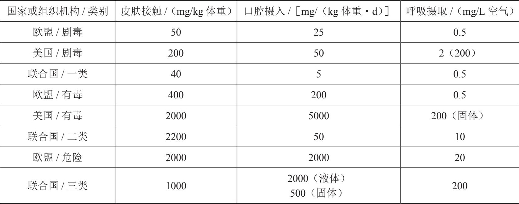 表1-1 不同国家或组织机构的LD50产品量对照表