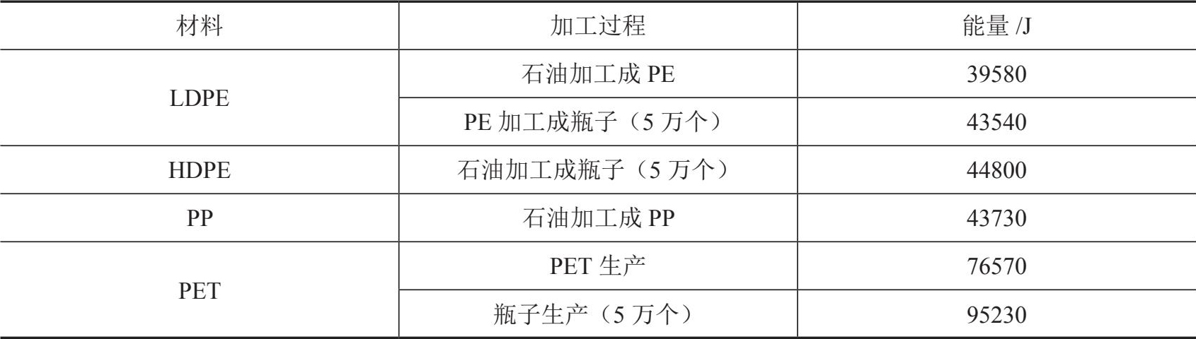 塑料包装制品的制造,首先是先将塑料树脂加热到熔化状态,然后通过一些加工工序(如挤压、吹塑、拉伸等)获得所需的造型。表3-6中列出一些塑料加工消耗能量的数据,这些加工过程需要通过机械来实现,而这些机械要靠电能来控制。塑料包装的再循环与再使用存在很多困难,用于食品包装的塑料材料的再循环已被禁止。塑料包装材料的再使用同玻璃包装材料类似,即回收后再熔化并重新制成新的包装造型。当然塑料包装废品也可以用来制造其他产品,如花盆、垃圾袋等。塑料能够以单体的形式再循环或利用,使其含有的能量得以恢复,但是其循环成本是非常高的。