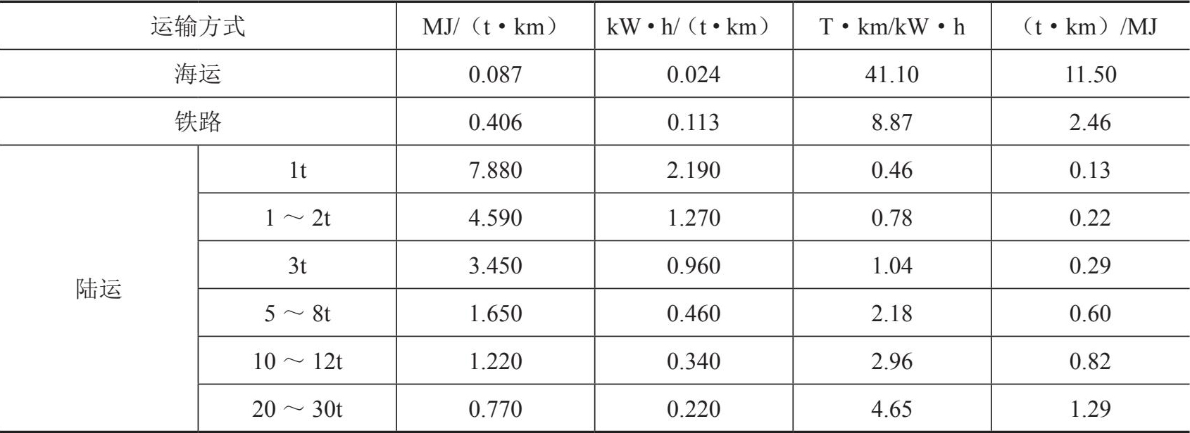 此外,包装辅料的生产,比如缓冲材料、护棱、护角、胶带、捆扎材料等,也需要消耗一定的能源。包装运输中需要消耗大量的资源,包装的“重量”是影响运输成本的主要因素。包装运输的方式有空运、海运、火车运输、卡车运输等。几种运输方式相比,空运效率高、能耗高、费用昂贵,海运慢、能耗较低、费用便宜。单位重量的平均能量消耗率,用kW和10 6 J表示。表3-8给出了各种运输方式的运输效率和平均能耗,它说明随着载重量的增加,公路运输相对能耗较低。