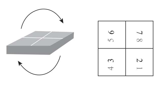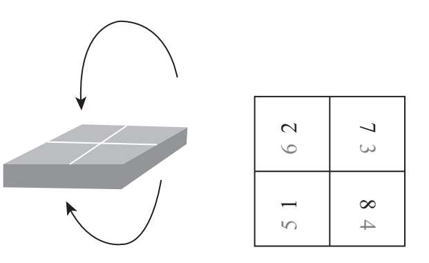 自翻印刷是一块印版在纸两面印刷,但纸的翻法是常规翻法,叼口方向不变,如图 2-6所示。一般 16 开杂志封面印刷常采用这种方式。例如,印一种杂志的 4 个封面,可以把版拼成一个 4 开,然后上 4 开机印刷。印完一面后自翻印刷,裁切后一个 4 开可得两个封面。