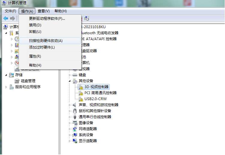 (4)单击“操作”,选择“扫描监测硬件改动”进行扫描。