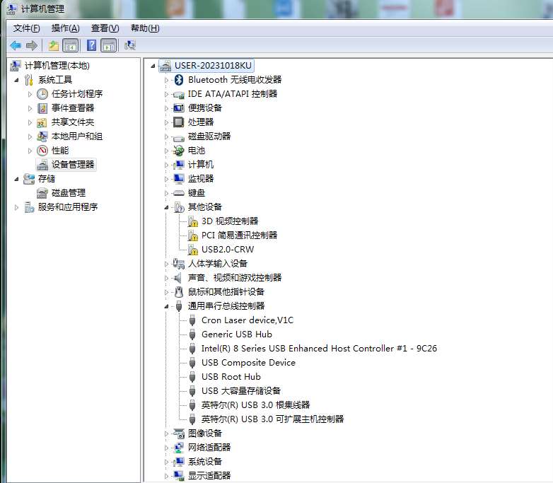 (9)安装完成之后,设备管理器的“通用串行总线控制器”下的第一行显示:Cron Laser device,V1C,说明CTP设备已成功安装USB驱动,如图 3-7 所示。