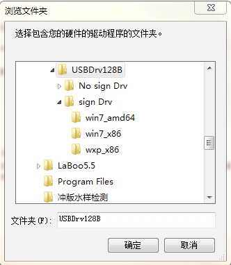 (7)手动选择USB驱动安装路径,如图 3-5 所示,安装WIN7 64bit的USB驱动;在Laboo安装目录下找到USBDrv128B\USBDrv128B\sign Drv\win7_amd64,单击“确定”。确认路径正确之后,选择“下一步”。